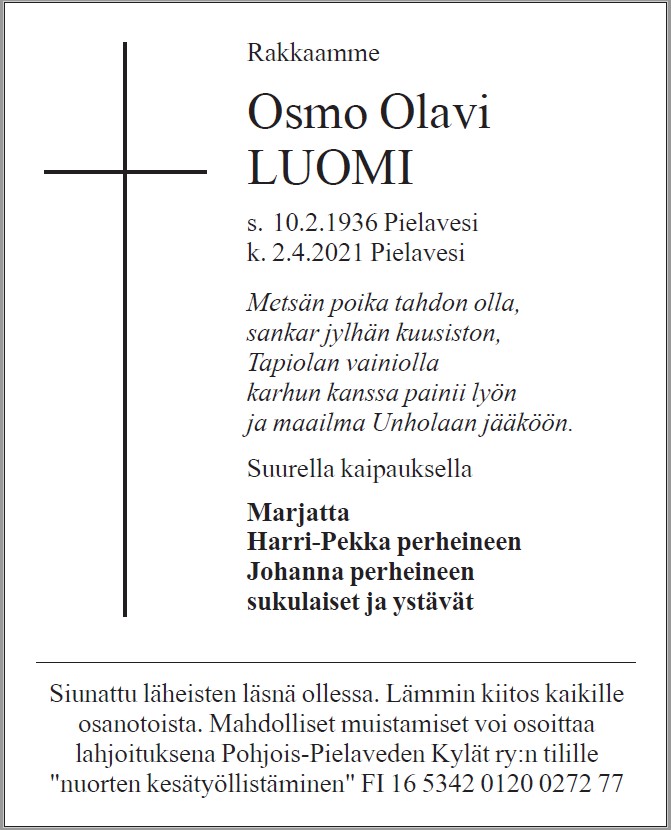 Osmo Luomi (10.2.1936 – 2.4.2021)