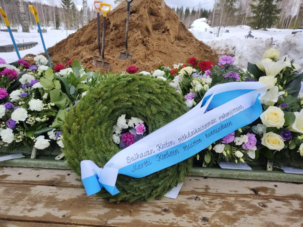 Voimistelu ja Urheiluseura Sulkavan Koitto ry:n hallitus hyvästeli Martin laskien arkulle havuseppeleen.
