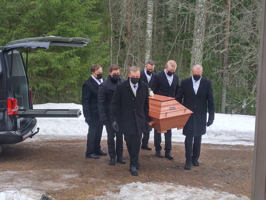 Kuvassa arkun vasemmalla puolella Juha ja Janne Keränen, Jukka Ryhänen, Kalle Keränen, Harri Ryhänen ja Harri Tiilikainen.