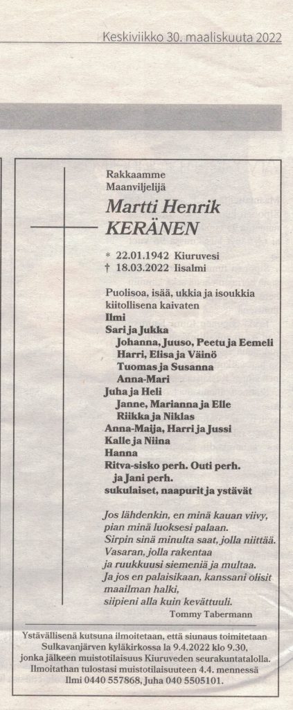Yhdistyksemme pitkäaikainen puheenjohtaja Martti Keränen (22.1.1942 – 18.3.2022) siunattiin lauantaina 9.4.2022 haudanlepoon. Sulkavanjärven kirkko täyttyi saattoväestä. Siunauksen toimitti kappalainen Mirita Häyrynen.