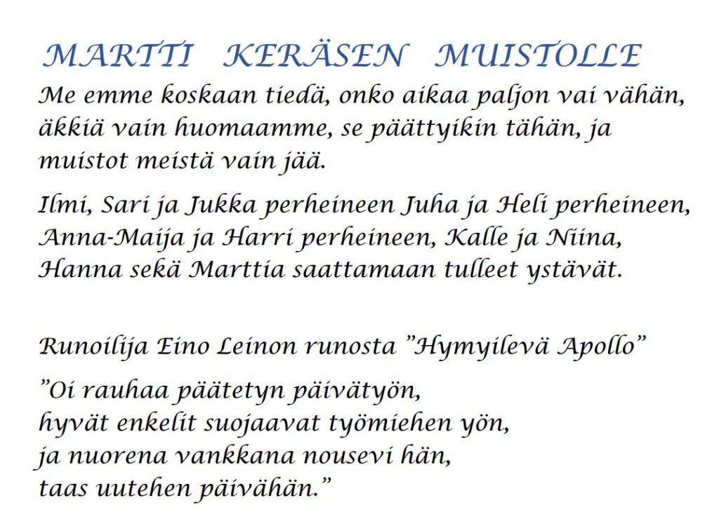 Muistotilaisuus pidettiin Kiuruveden seurakuntatalolla. Muistotilaisuudessa muistopuheen piti Martin tytär rehtori Anna-Maija koskettavan muistopuheen.