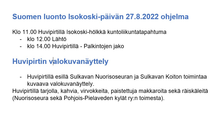 Tämä tapahtuma järjestetään yhteistyössä paikallisten yhdistysten kesken. Harvempi on tietoinen siitä, että Sulkavan Koitto ja ja Sulkavan Nuorisoseura rakensivat yhdessä v. 1920 alullepanemansa Huvipirtin seurojentalon. Salmettaressa18.11.1920 julkaistun ilmoituksen mukaan: Pielaveden Sulkavan Nuorisoseura ja V. U. Sulkavan Koitto julkaisi 18.11.1920 Salmettaressa ilmoituksen. ”Urakkahuutokauppa – Pielaveden Sulkavan N:seura ja U.S.Koiton talon rakentaminen tarjotaan tehtäväksi marrask. 28. p:nä klo 9 a.p. talon tulevalla paikalla Nousialan kylästä, paikan päällä lähemmin ilmoitettavilla ehdoilla. Piirustus- ja työselitys nähtävänä Armas Nousiaisen luona Peltolasta. Rakennustoimikunta hankkii kaikki tarpeet. Pielaveden Sulkavalla 15.11.20. – Rakennustoimikunnan puolesta: Armas Nousiainen.”