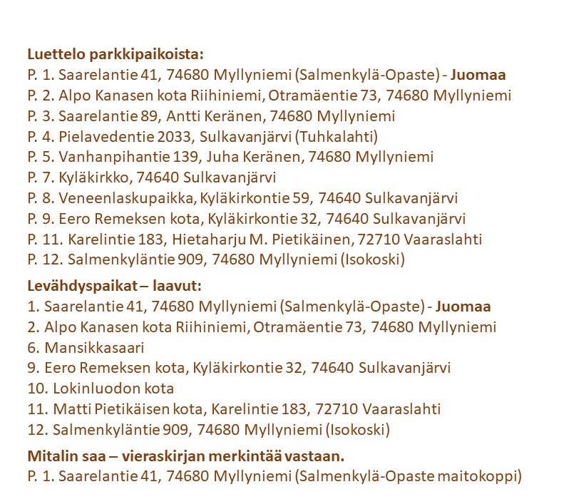 Oheissa latukartta, mistä ilmenee parkkipaikat. levähdyspaikat sekä reitti.